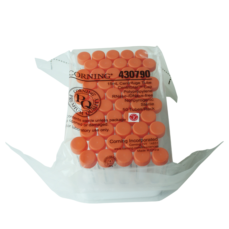 Corning® 15 mL clear polypropylene (PP) centrifuge tubes come with the advanced polyethylene CentriStar™ caps and are packed 50 per rack. The CentriStar™ Cap has a easy-on/easy-off flat top and offers advanced ergonomics with its wider knurls and roll-over edge design for easier gripping. This leak-proof design comes with a revolutionary plug feature that virtually eliminates all seepage when used under recommended conditions.